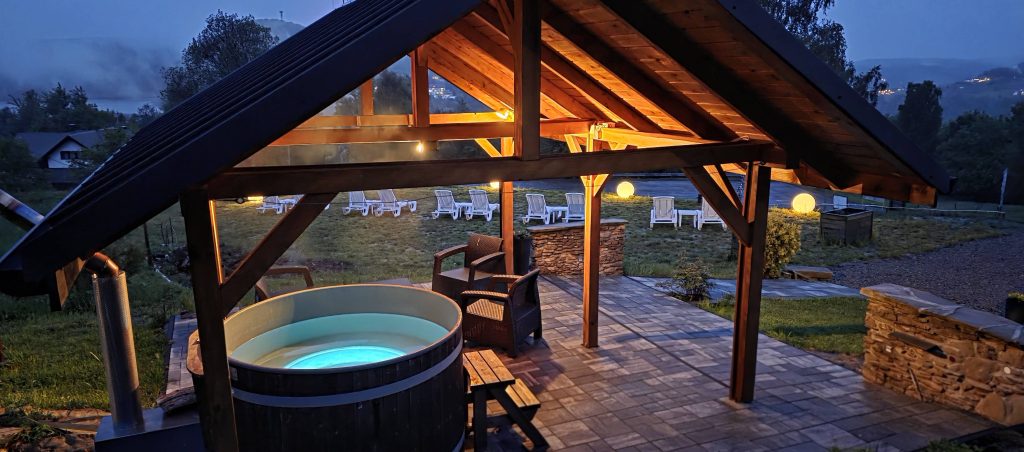 Prywatny wieczór w altanie relaksu ,gdzie można zrelaksować się po aktywnym dniu. Bo niema nic lepszego niż gorąca kąpiel na świeżym powietrzu z cudownym widokiem na jezioro i lasy